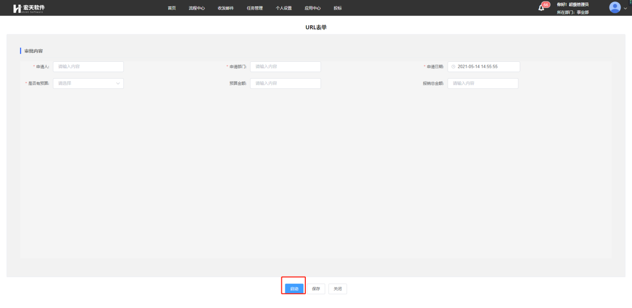 点击启动流程时将自动调用vue表单文件的saveData方法,保存表单数据并传入全局变量给x7流程系统,并根据是否有预算的值,走向不同的分支,完成流程审批。