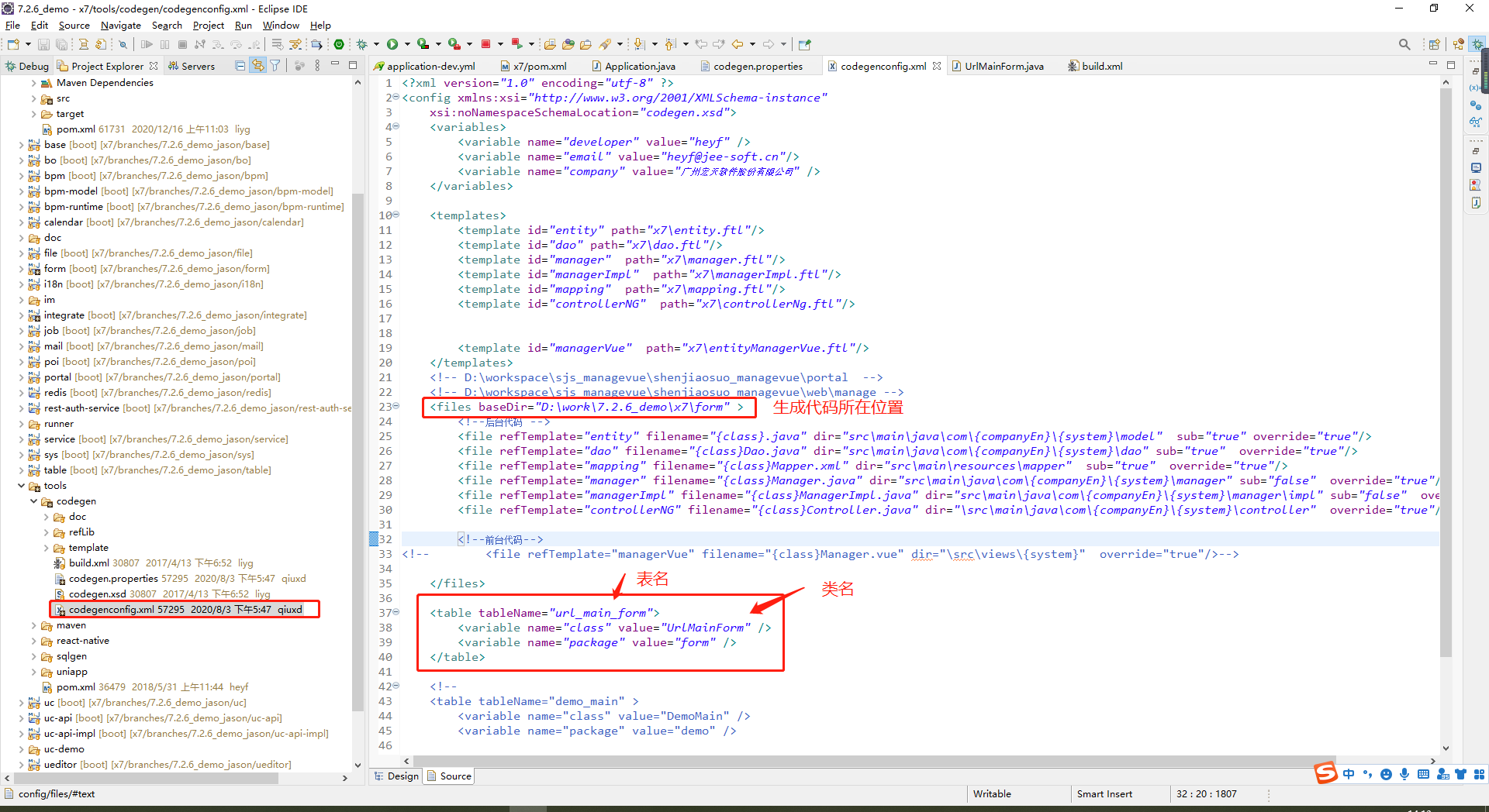 配置生成代码的位置、表名和类名