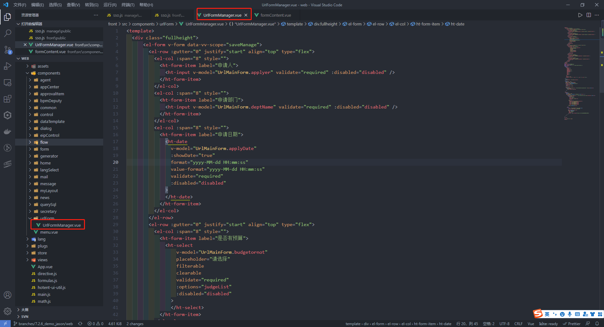 1、创建一个vue文件,表单内容可模板生成可自行设计,本次文件存放在front项目下