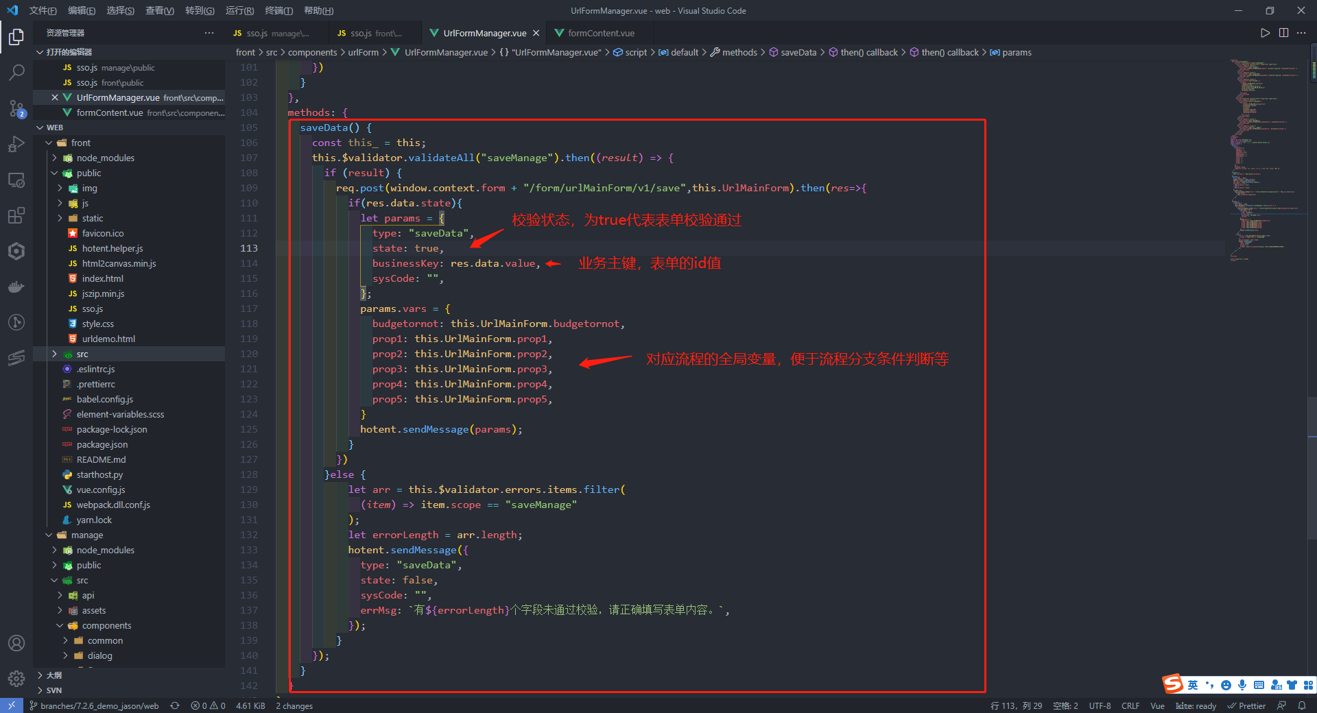若需扩展其他条件,只需再添加全局变量,在vue表单文件的saveData方法的中传入即可
