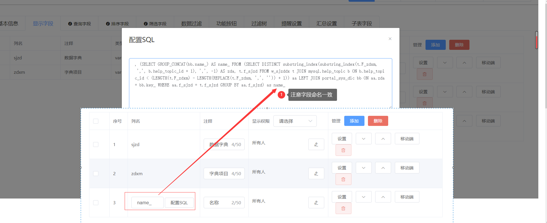 注意事项:如虚拟SQL字段查询语句较长,记得为其进行命名哦,并且名称需与显示字段设置的名称保持一致