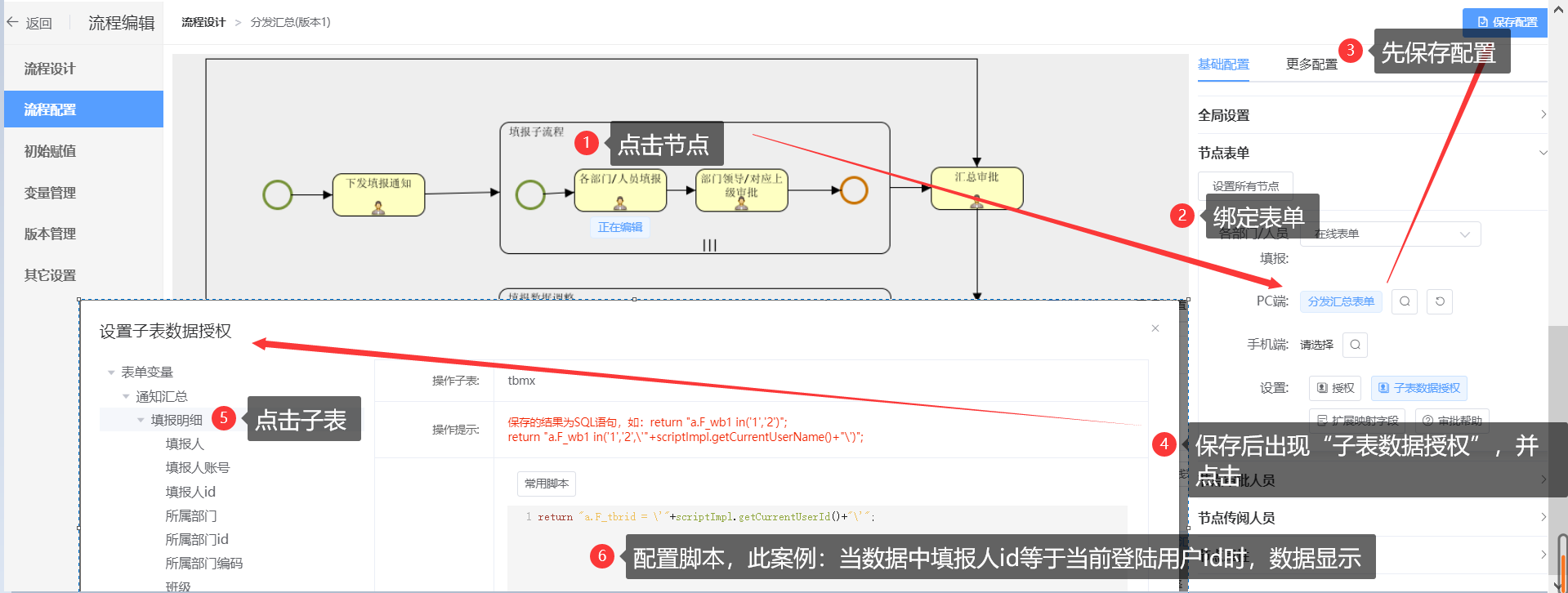 填报节点授权脚本:当前用户id进行过滤,用户只能看到自己填报的数据 return "a.F_tbrid = \'"+scriptImpl.getCurrentUserId()+"\'"; 上级审批节点授权脚本:当前用户主组织id进行过滤,用户可看到自己组织的数据 return "a.F_ssbmid = \'"+scriptImpl.getIUserMainOrgID()+"\'";