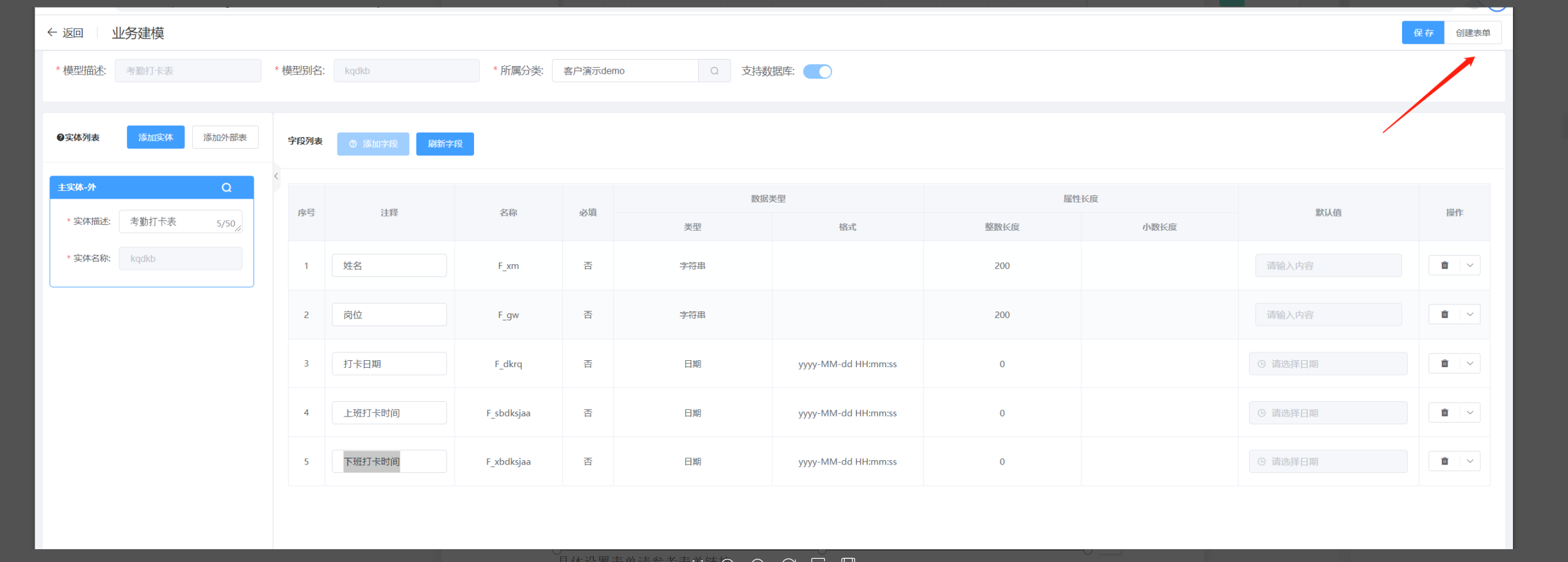 首先需建立对应的表字段,字段如下:姓名、岗位、打卡日期、上班打卡时间、下班打卡时间,日期字段类型需要选择日期类型,如图: