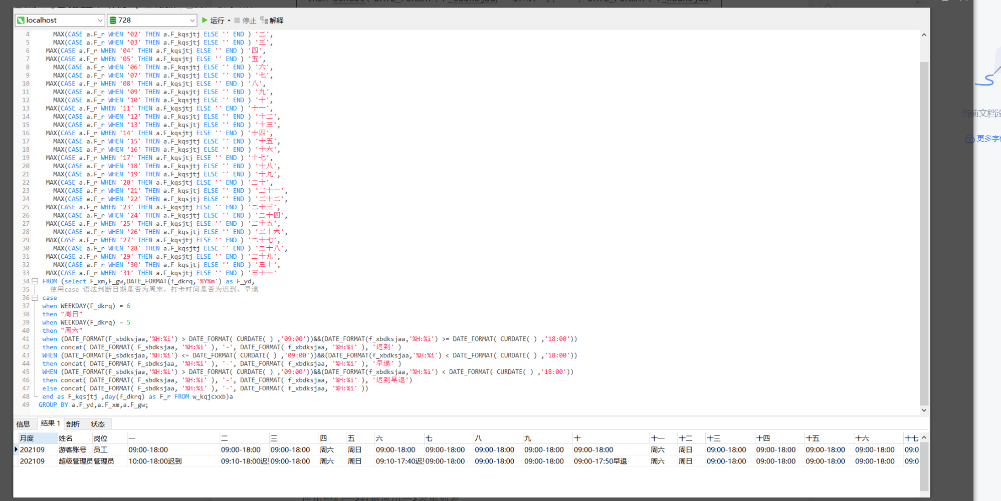 -- 使用case 语法判断日期是否为周末,打卡时间是否为迟到、早退