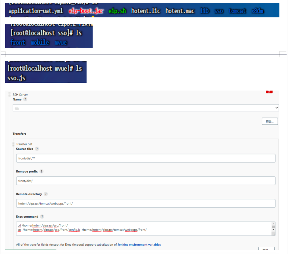 前端部署时需要使用SSO文件确定访问的端口等信息,在使用jenkins时,会把打包的文件全部覆盖过去,因此需要提前配置好SSO,放到一个文件夹中,以做备用,当打包好的文件更新完后,再把调整好的SSO文件覆盖到前端文件目录中。
