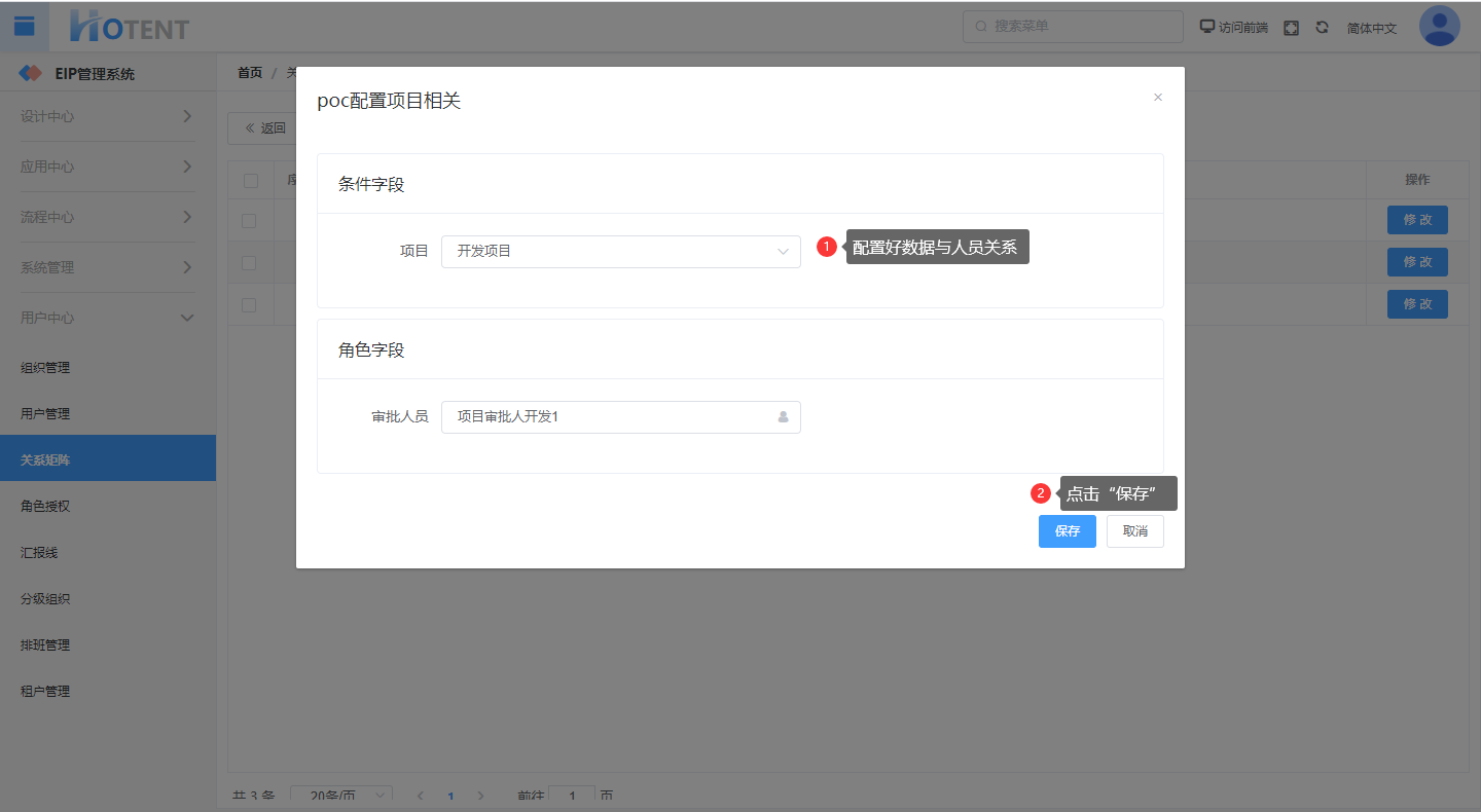 第六步:对已发布的矩阵进行人员配置,根据不同的组织设置对应的角色用户