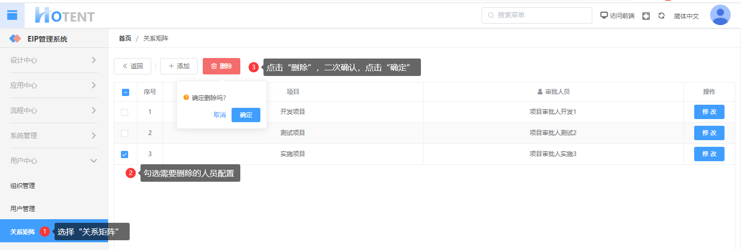 操作:【用户中心】→【关系矩阵】→选择对应的矩阵点击“人员设置”→勾选需要删除的人员配置→点击“删除”,二次确认,点击“确认”