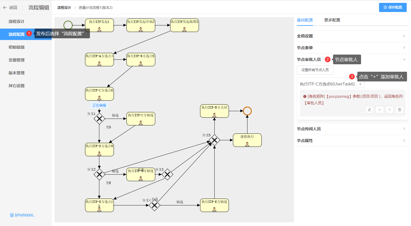 1.【流程中心】→【流程设计】→【流程配置】→在“基础属性”中点击“节点审批人”→点击“+”添加审批人