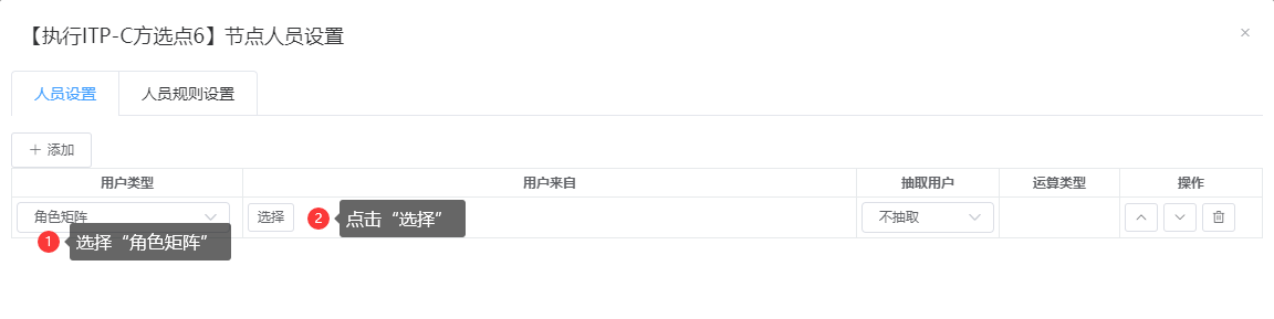 2.点击“添加”→“用户类型”选择“角色矩阵”→点击“选择”→配置相关的数据→点击“确定”