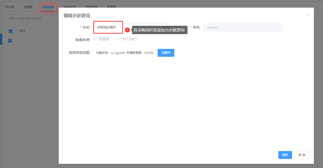 第二步:将采购组织的数据表添加为对话框或者关联查询;