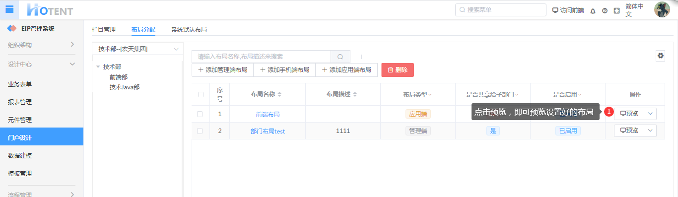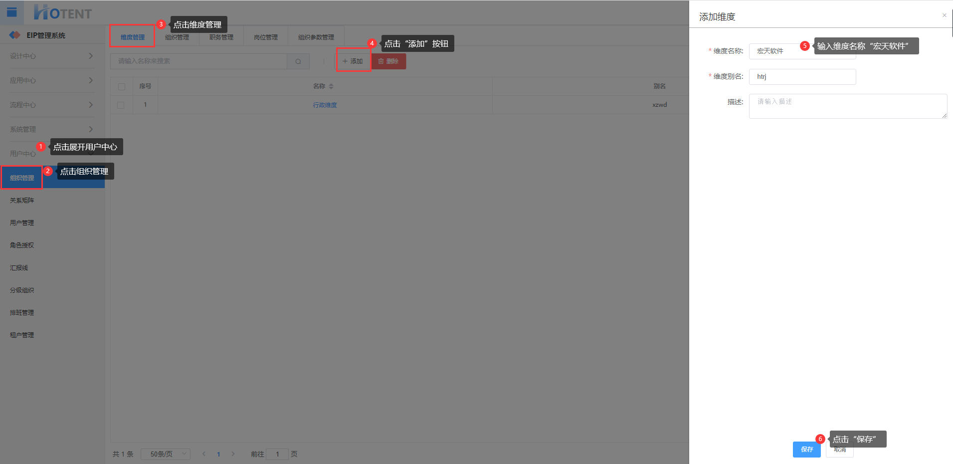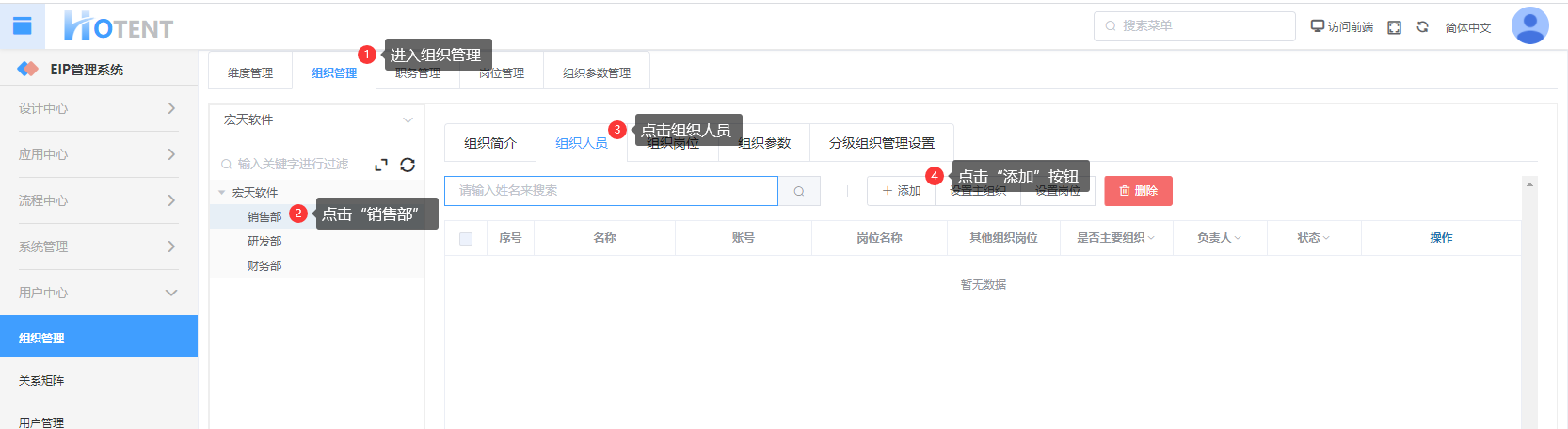 第五步:在宏天软件下添加组织:研发部、财务部、销售部