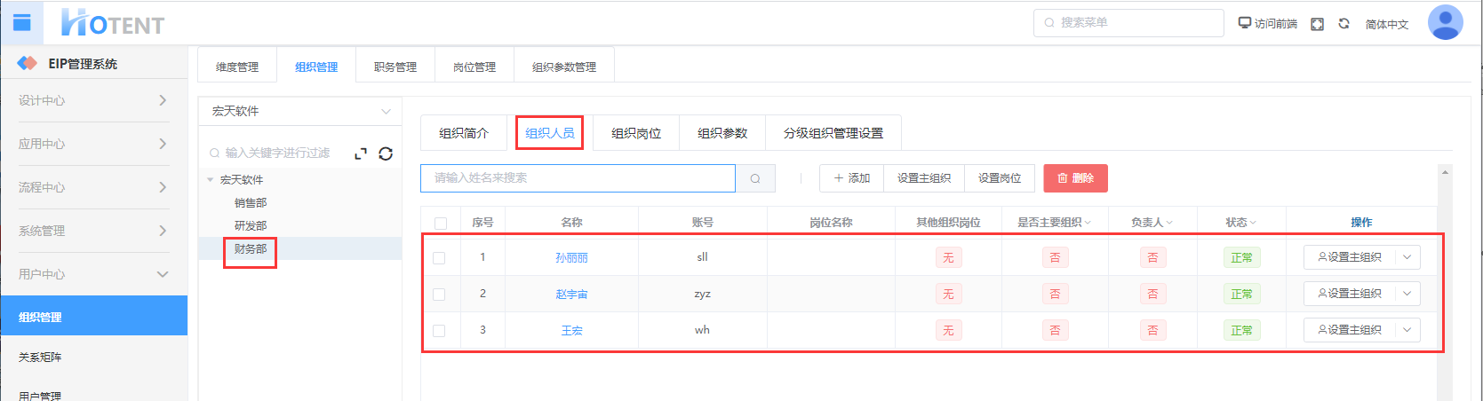 第十一步:设置用户的主组织(组织架构中可能会存在一个用户属于多个组织的情况,我们可通过设置主组织来设置用户的默认组织)