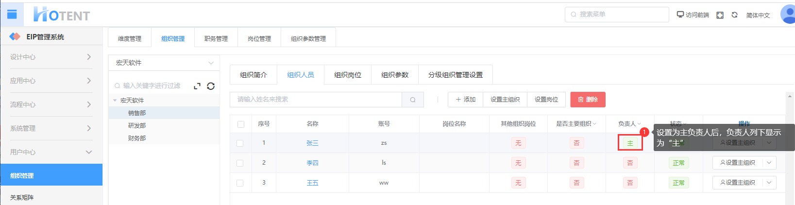 第九步:设置组织主负责人(即部门经理):设置“销售部”的主负责人为“张三”;
