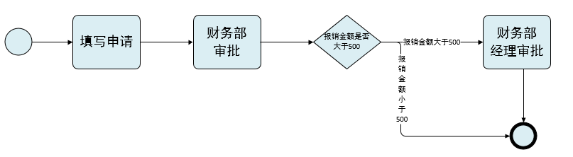 2. 若表单申请报销总金额大于500则需要财务部门经理审批,小于500则结束流程;
