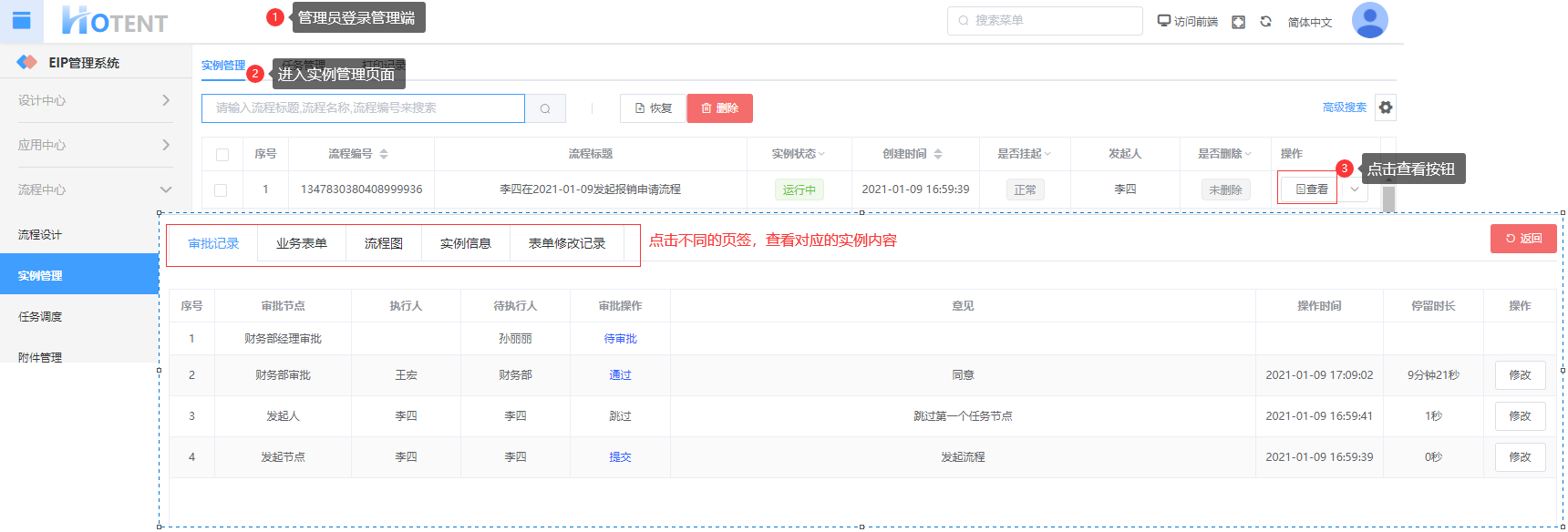 流程启动后,可在(【实例管理】à【实例管理】)中查看流程实例明细;
