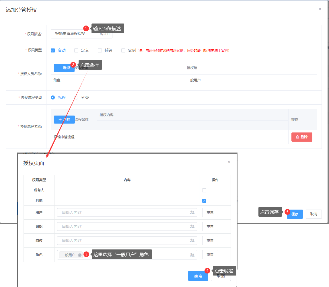 流程配置完成后,需要将流程授权给一般用户,一般用户才有权限启动“报销申请流程”操作步骤如下: