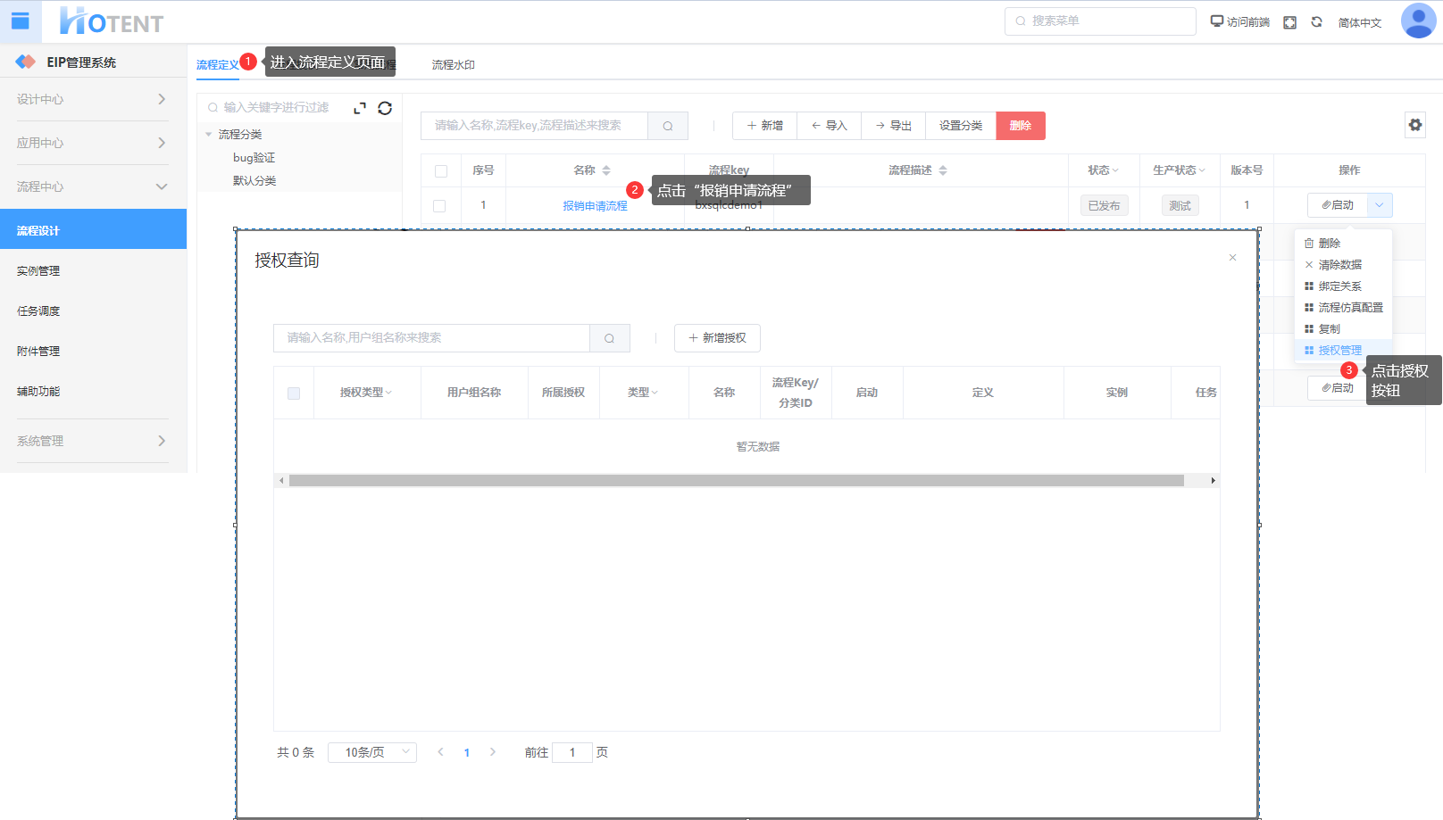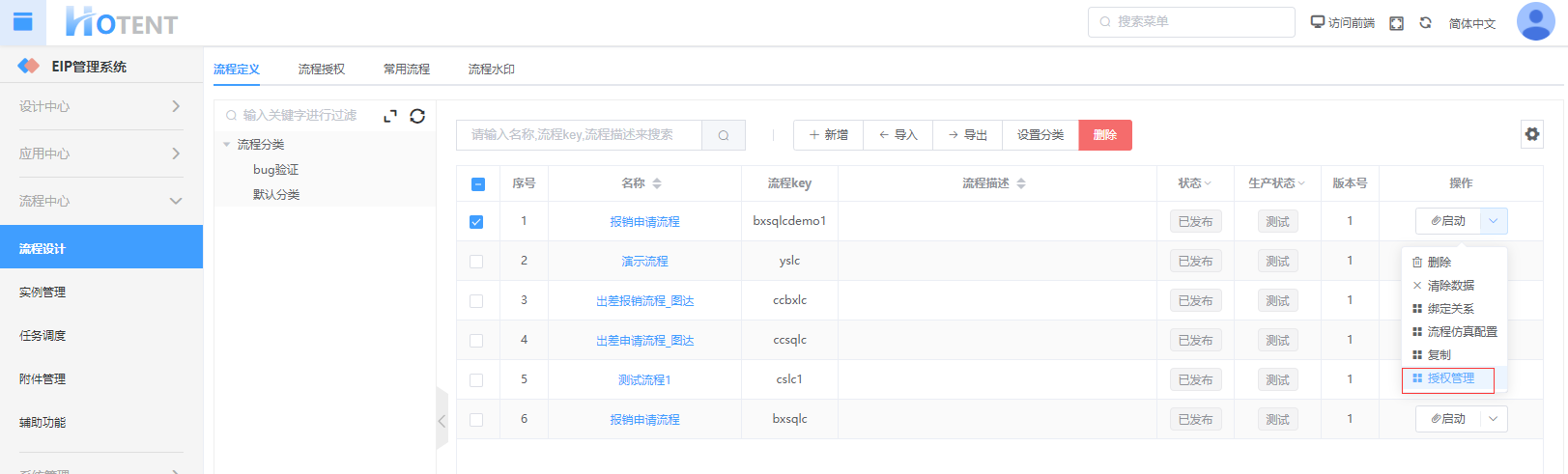 第一步:进入【流程设计】->【流程定义】页面,选择“报销申请流程”点击操作列下的{授权管理}按钮;