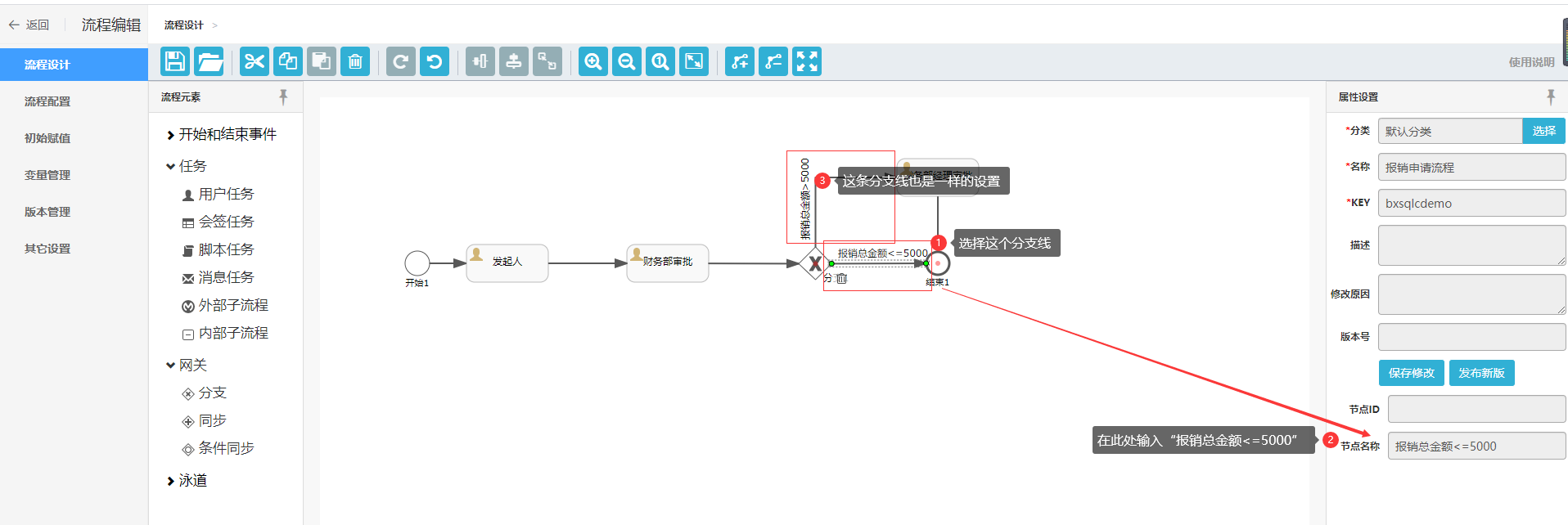 设置分支条件:当报销总金额大于5000时,流转到“财务部经理审批”;