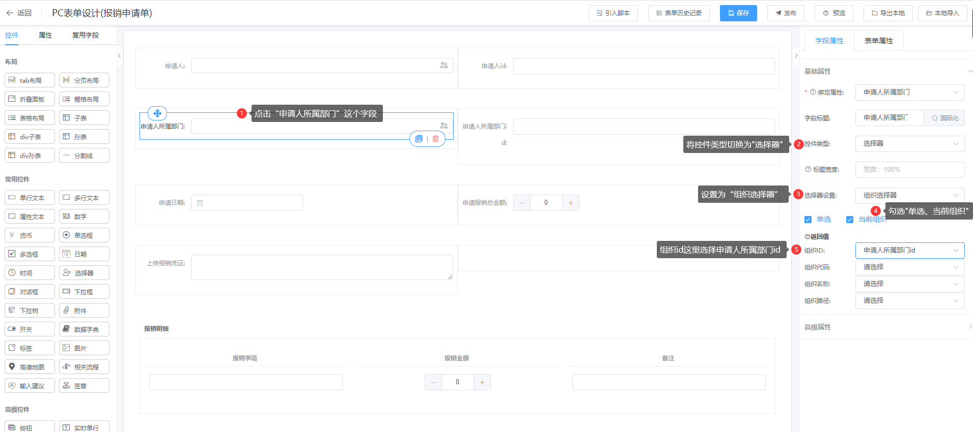 2、设置申请人所属部门的控件为“组织选择器”,设置为默认显示当前组织,并将组织id,返回到申请人所属部门id中,配置步骤如下图: