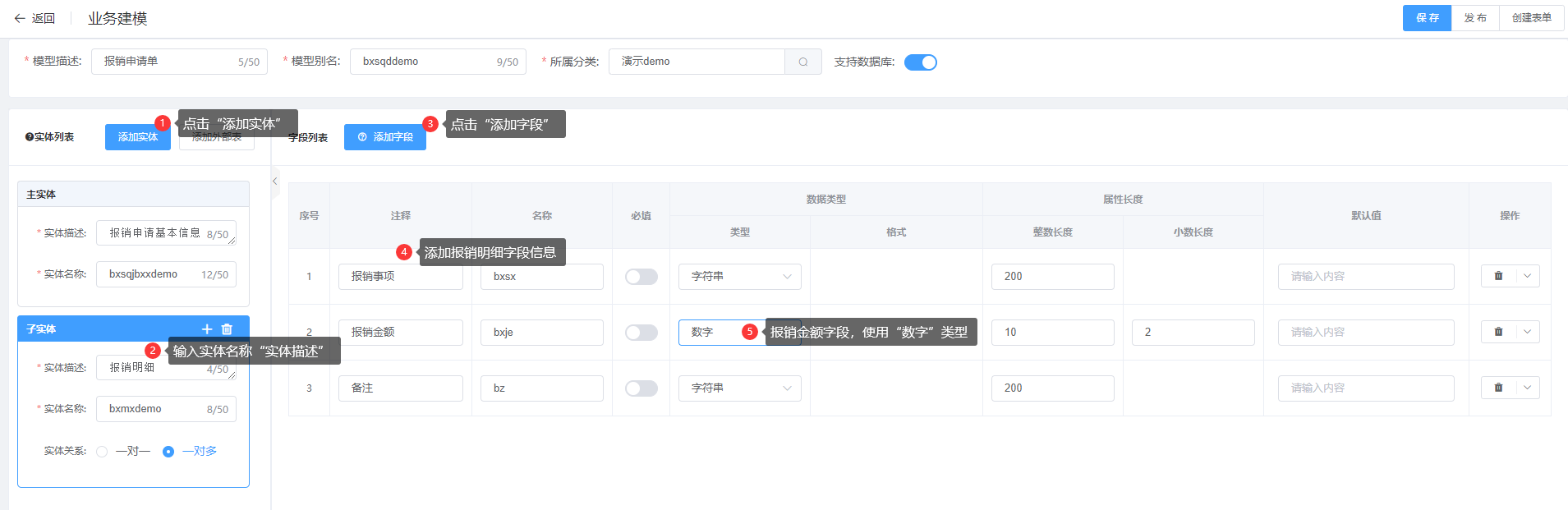 第四步:添加“报销明细”子实体: